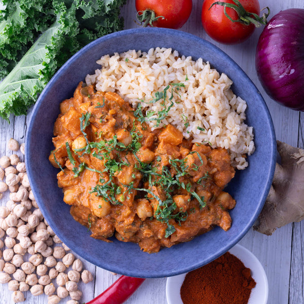 Ingredients: brown rice, chickpeas, coconut, cauliflower, kale, peanuts, cashews, tomatoes, smoked paprika, red curry paste, garam masala, ginger, cumin, garlic, onion, date puree, rice bran oil, pink salt.